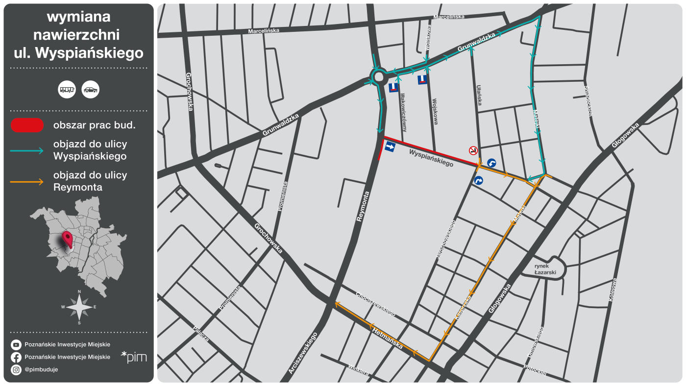 Zmiany skutkować będą też modyfikacjami w kursowaniu autobusów jeżdżących ul. Wyspiańskiego, szczegóły w komunikacie ZTM Poznań.