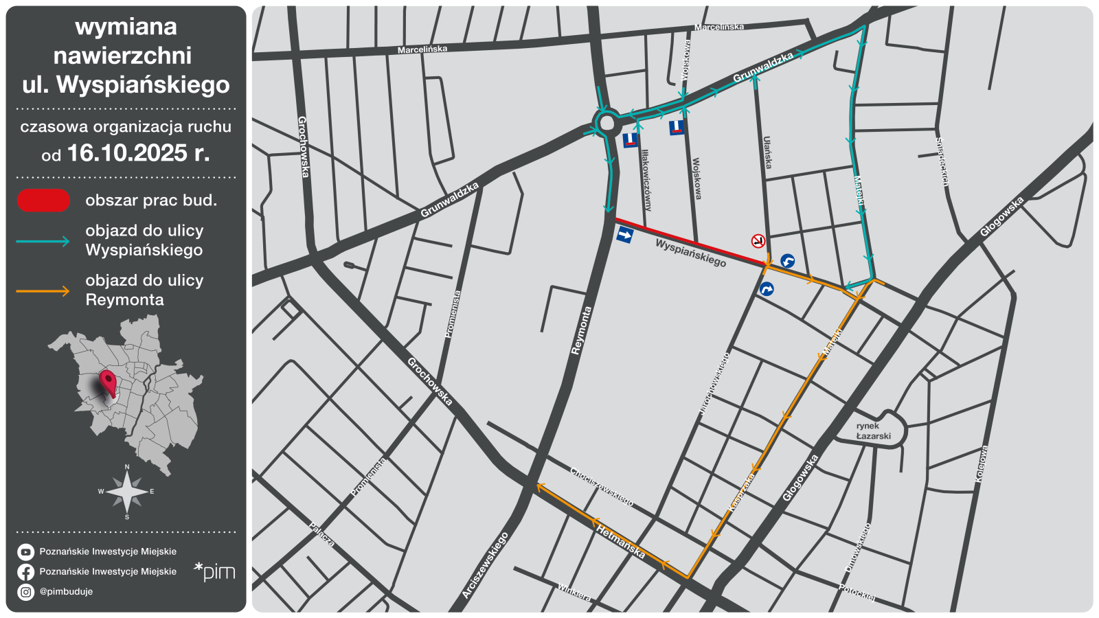 Od 3 października obowiązywać będzie czasowa organizacja ruchu na ul. Wyspiańskiego. Prace realizowane będą połówkowo, co oznacza, że gdy jeden pas jezdni będzie zajęty, drugi pozostanie przejezdny, a następnie sytuacja się odwróci. W pierwszym etapie wyłączona z ruchu zostanie północna część jezdni. Przejazd możliwy będzie tylko w jednym kierunku - od ul. Reymonta do ul. Jarochowskiego. Nie będzie możliwości skrętu z ul. Wyspiańskiego w ul. Iłłakowiczówny i Wojskową, z obu tych ulic nie będzie także wyjazdu na ul. Wyspiańskiego (objazd przez ul. Grunwaldzką i Matejki lub Grunwaldzką i Reymonta).