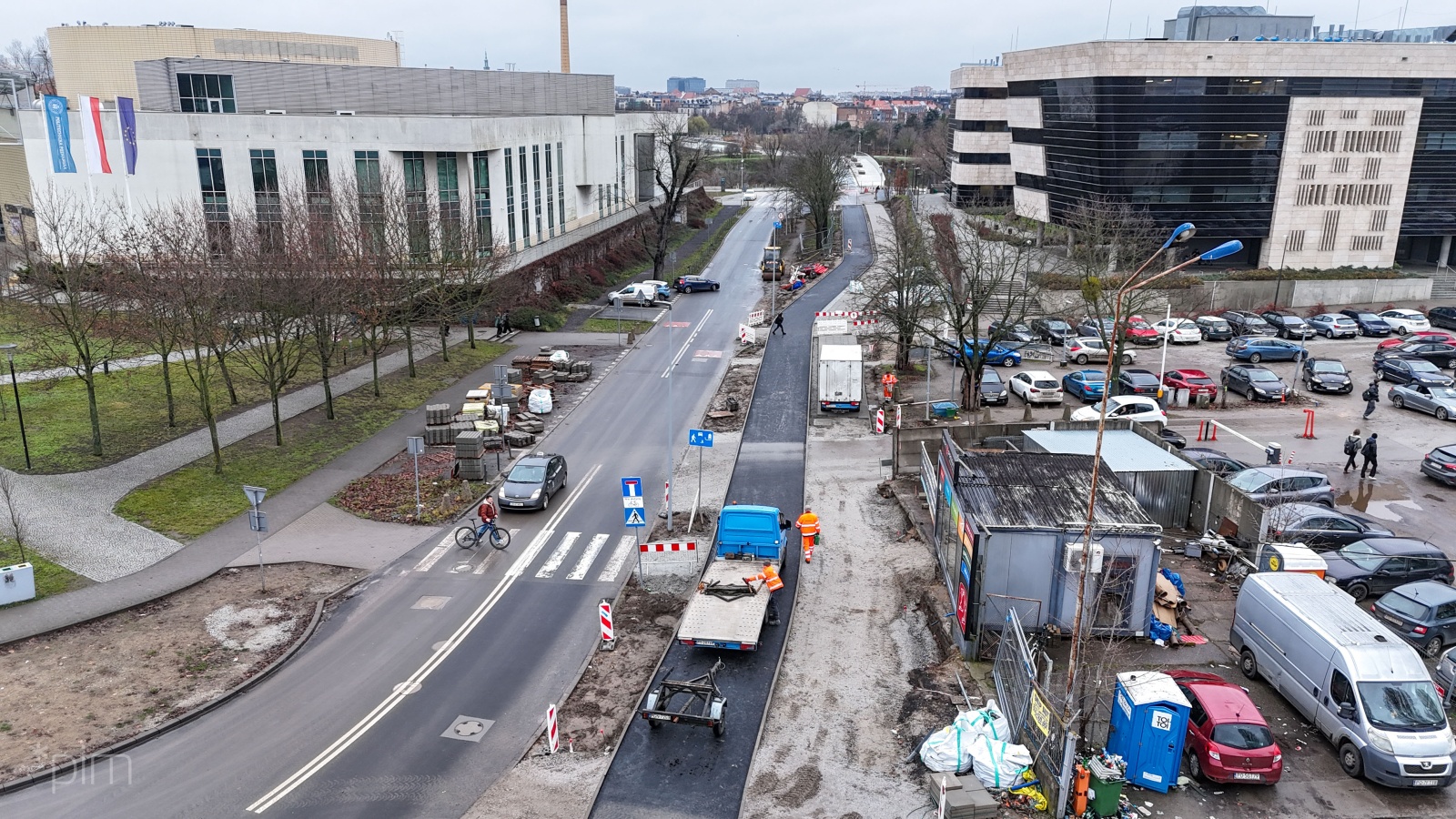 - Niemal na całym odcinku powstałej konstrukcji drogi rowerowej ułożona została warstwa wiążąca nawierzchni, do wykonania pozostał jedynie fragment w obrębie skrzyżowania z ul. Jana Pawła II. Jeśli pogoda pozwoli, to pod koniec bieżącego tygodnia całość pokryta zostanie ostatnią, ścieralną warstwą. Równolegle postępują prace brukarskie w zakresie chodnika i opasek kamiennych, a do wykonania pozostaną jeszcze m.in. nasadzenia zieleni – mówi Tomasz Płóciniczak, wiceprezes spółki Poznańskie Inwestycje Miejskie.