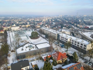 W otoczeniu obu budynków nasadzona została nowa zieleń, powstały nowe chodniki, miejsca parkingowe oraz nowe ogrodzenie.