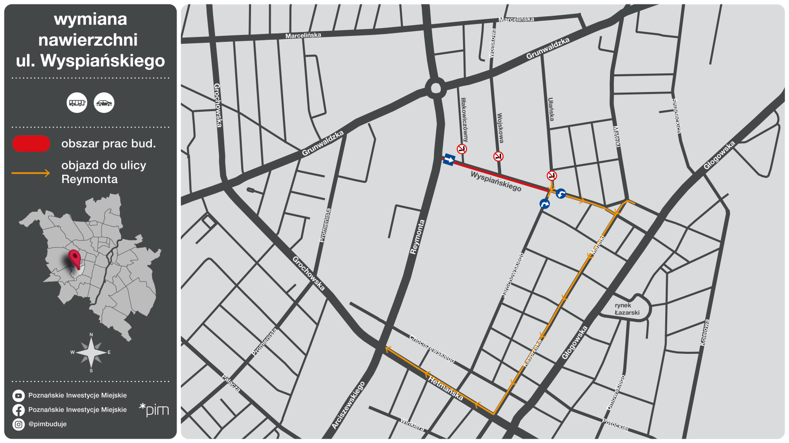 Trwają prace związane z wymianą nawierzchni ul. Wyspiańskiego na odcinku od ul. Reymonta do ul. Jarochowskiego. W przyszłym tygodniu wykonawca przystąpi do regulacji krat wpustów deszczowych oraz wymiany studni. Z tego planowana jest zmiana organizacji ruchu polegająca na wyłączeniu jezdni południowej ul. Wyspiańskiego i otwarciu jezdni północnej. Tym samym w dalszym ciągu ruch odbywać będzie się jednokierunkowo. Wprowadzenie zmiany planowane jest na przełom 27 i 28 października, przy czym realizacja zaplanowanych robót uzależniona jest warunków atmosferycznych.