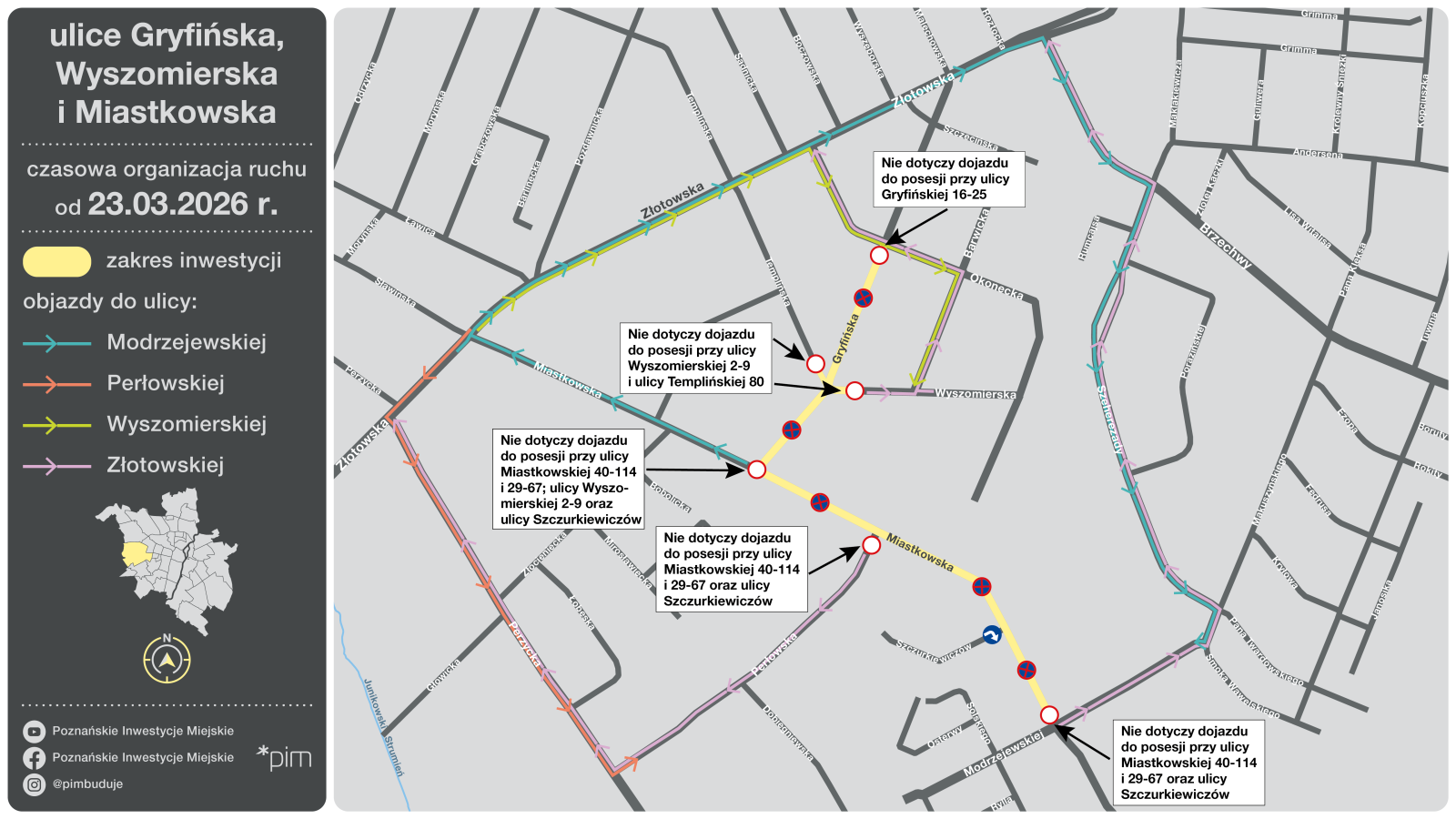 W efekcie zamknięta zostanie ul. Wyszomierska między Miastkowską a ul. Gryfińską i Templińską wraz ze skrzyżowaniem tych ulic. W tym samym czasie wyłączona z ruchu zostanie ul. Gryfińska od wskazanego skrzyżowania do ul. Okoneckiej. Objazdy poprowadzone zostaną ulicami: Modrzejewskiej, Makuszyńskiego, Szeherezady, Brzechwy, Złotowską, Barwicką, Perzycką i Perłowską. Dostęp do posesji zostanie zachowany.