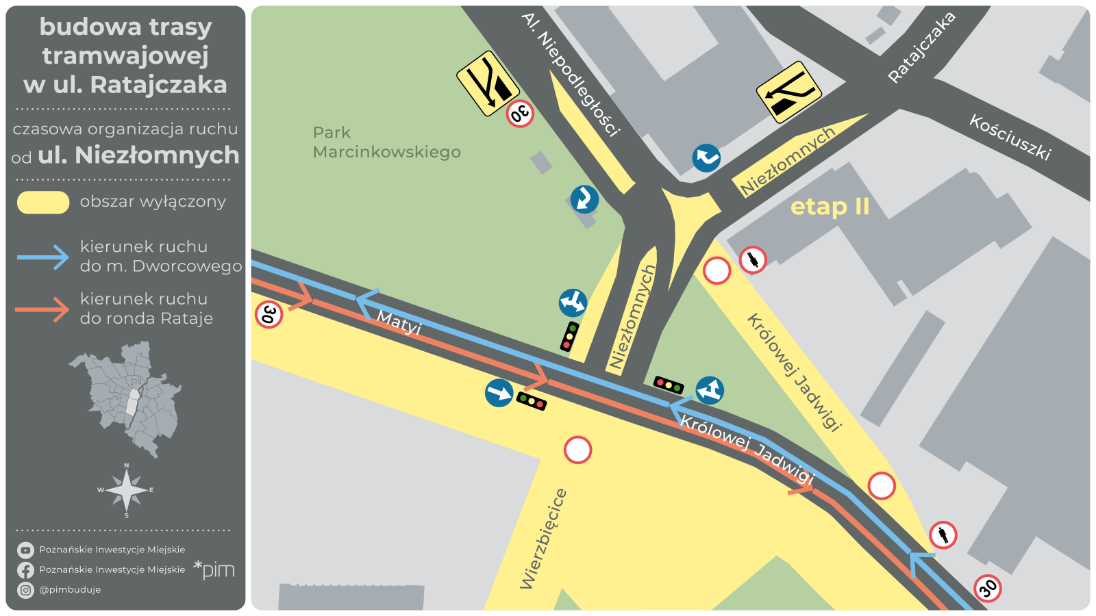 W rejonie węzła Wierzbięcice obowiązuje czasowa organizacja ruchu ze względu na budowę trasy tramwajowej w ul. Ratajczaka. 23 lutego (poniedziałek) zmieni się układ pasów ruchu na ul. Niezłomnych.