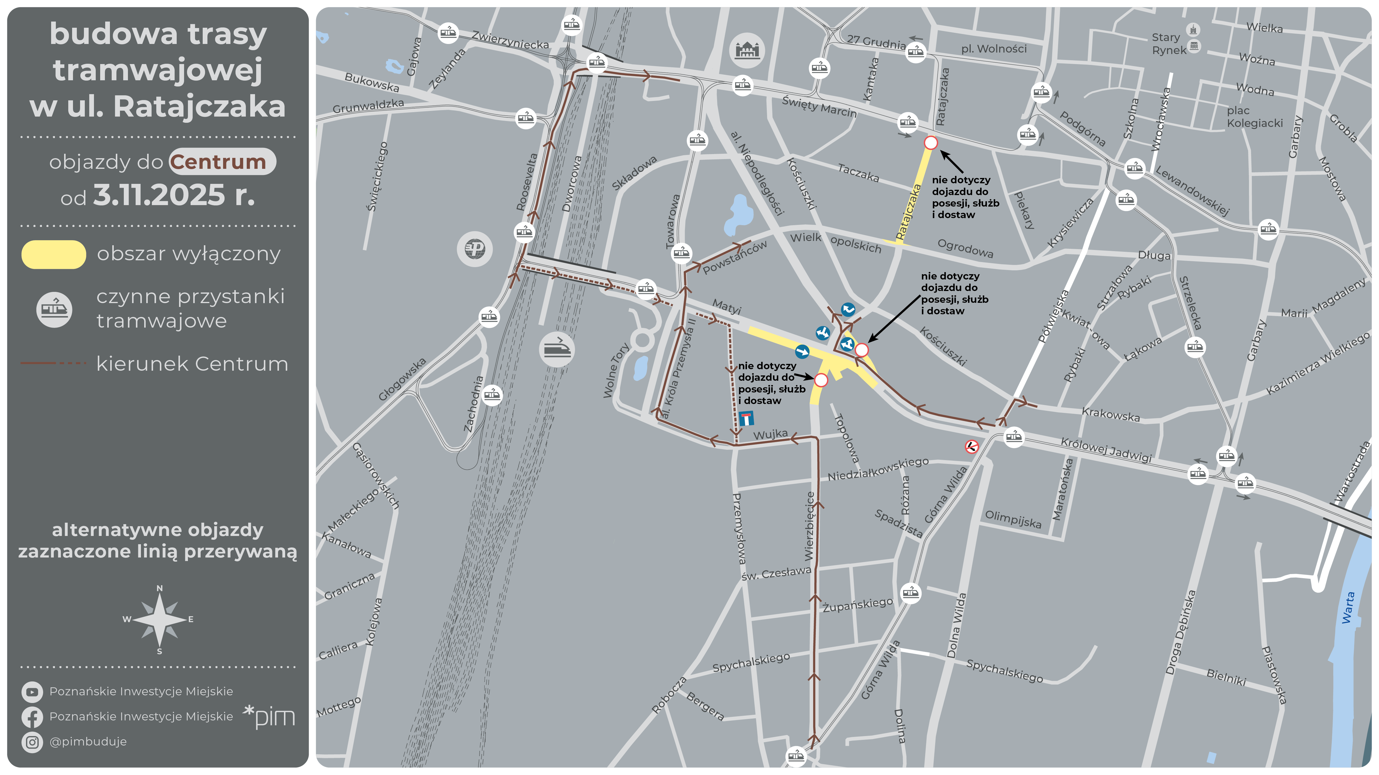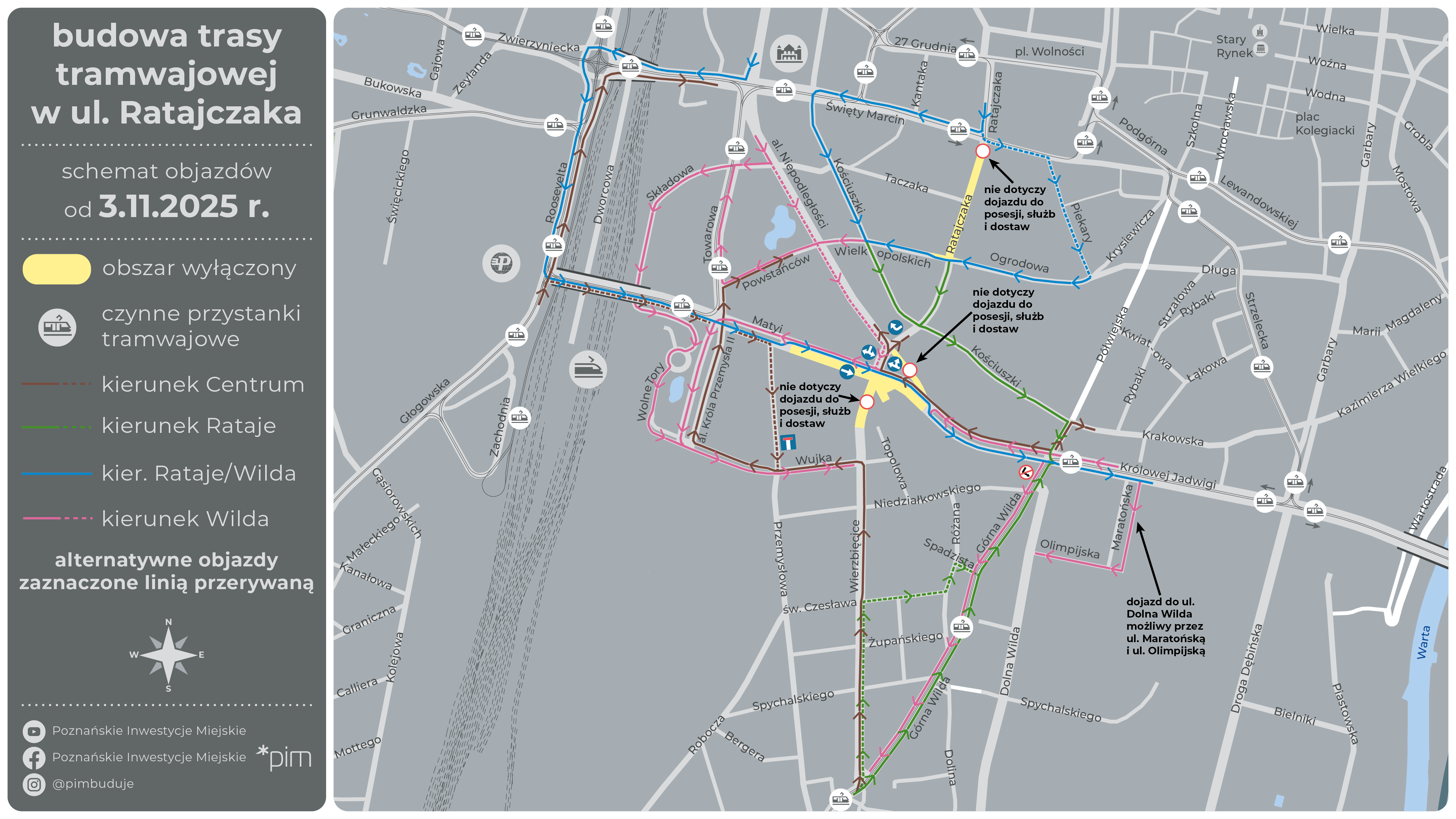 - W ostatnich tygodniach prowadzone były niewidoczne w terenie, ale intensywne przygotowania do inwestycji. Wykonawca koncentrował się na opracowaniu projektu czasowej organizacji ruchu, za nami wiele spotkań i ustaleń w zakresie najbardziej optymalnych rozwiązań. Zależy nam na sprawnym przeprowadzeniu prac budowlanych, by trwały możliwie najkrócej. Roboty równolegle rozpoczną się na węźle Wierzbięcice oraz na odcinku ul. Ratajczaka między Św. Marcinem a ul. Ogrodową. Wyłączenie torowiska na węźle skutkować będzie zmianami tras tramwajów, które z kolei zostaną skoordynowane pracami na moście Chrobrego, by tymczasowy układ tras był czytelny dla pasażerów – wyjaśnia Tomasz Płóciniczak, wiceprezes spółki Poznańskie Inwestycje Miejskie.