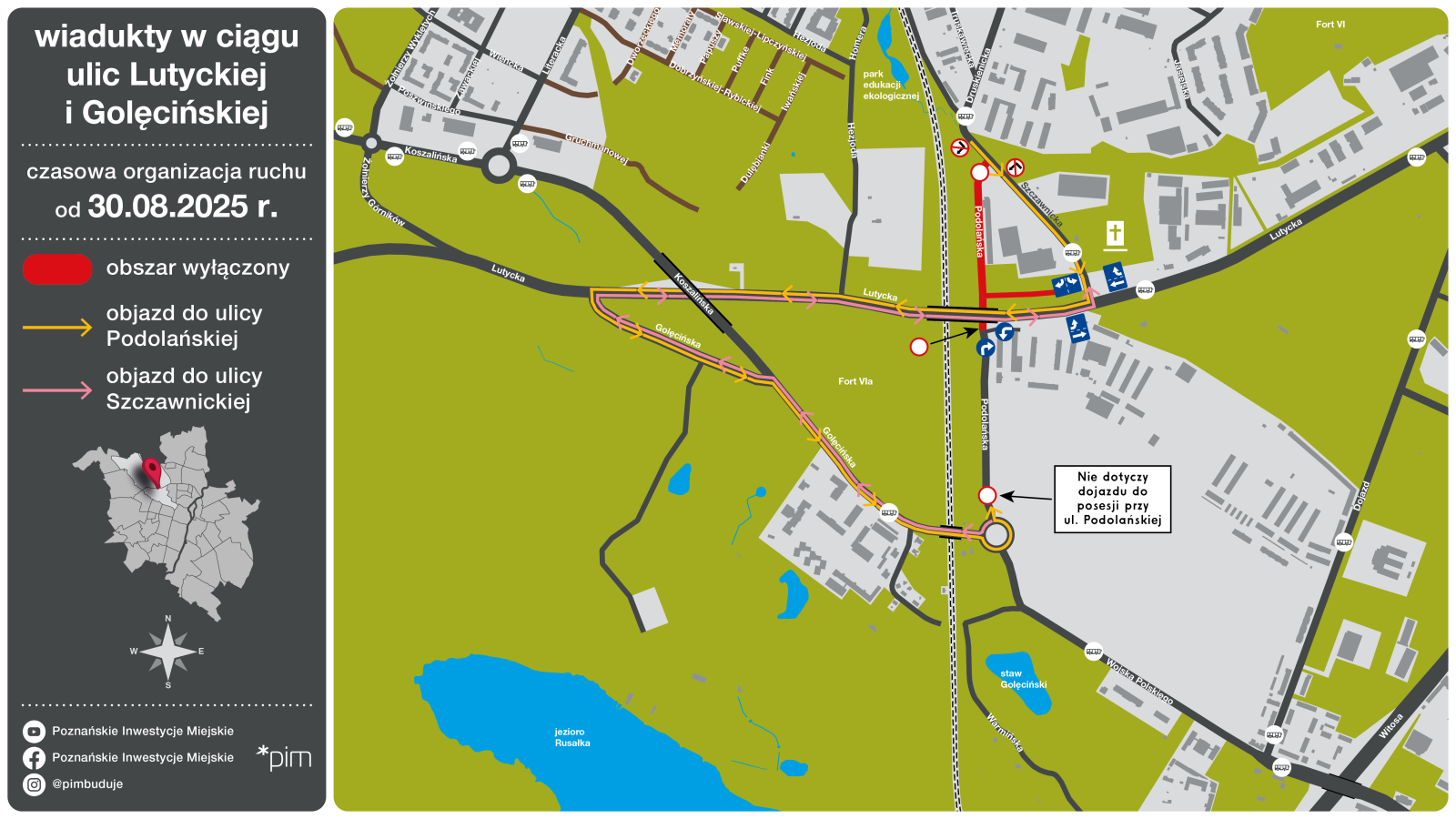 W nocy z 29 na 30 sierpnia ul. Podolańska zostanie wyłączona z ruchu, będą tam realizowane ostatnie prace po udostępnieniu wiaduktu w ciągu ul. Lutyckiej. Odcinek między nowym rondem przy ul. Golęcińskiej a ul. Lutycką będzie służył jedynie jako dojazd do posesji, a fragment od ul. Lutyckiej do ul. Szczawnickiej zostanie całkowicie zamknięty.
