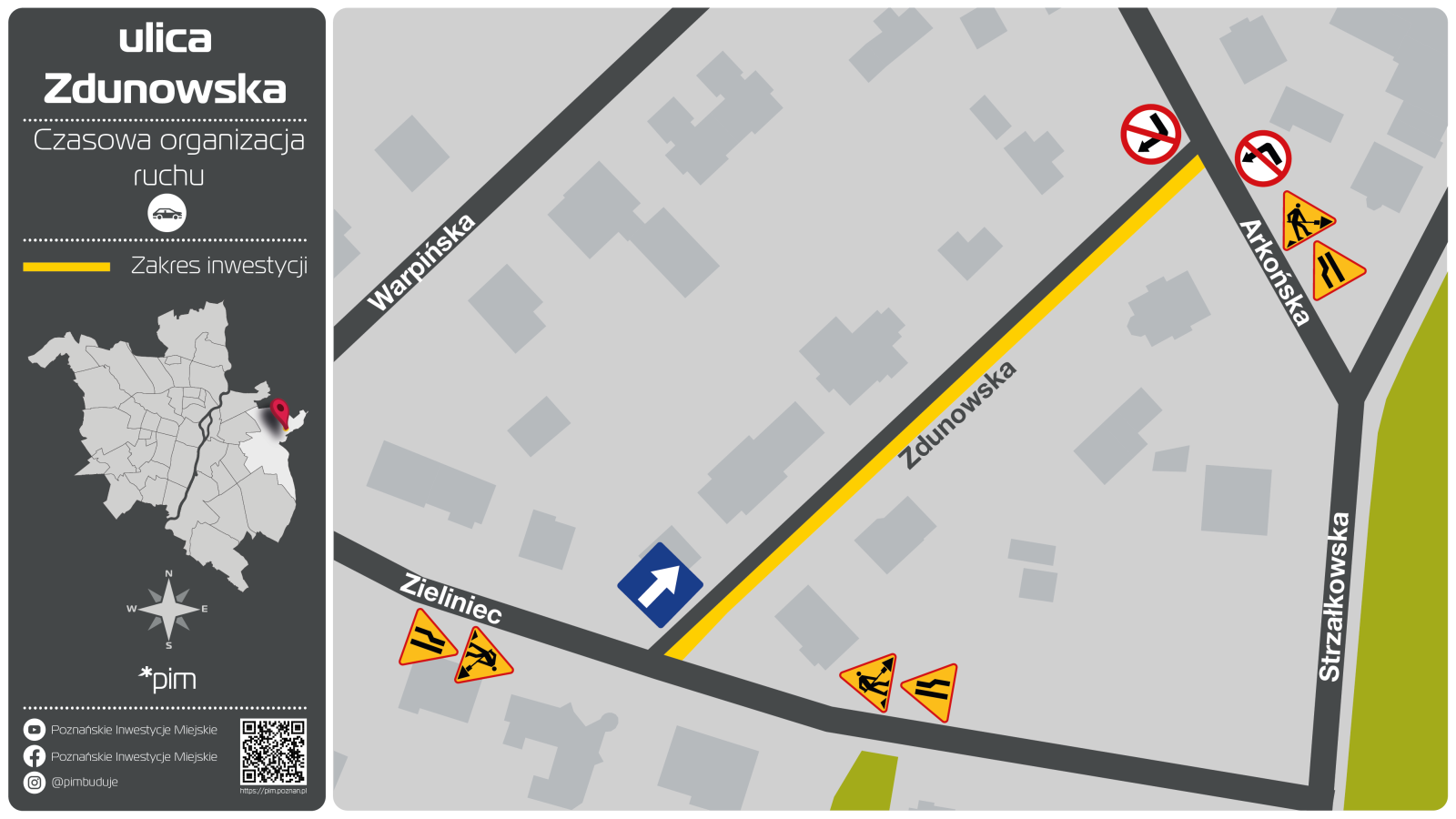 Wykonawca inwestycji przejął już plac budowy. W pierwszej kolejności roboty prowadzone będą na ul. Zdunowskiej, najpierw dotyczyć będą kanalizacji deszczowej na odcinku od strony ul. Zieliniec. Z tego względu na ul. Zdunowskiej wprowadzono ruch jednokierunkowy – od ul. Zieliniec w stronę ul. Arkońskiej. W kolejnych etapach prace realizowane będą także na ul. Starkowskiej. Prosimy o zachowanie ostrożności i zwracanie uwagi na bieżące oznakowanie.