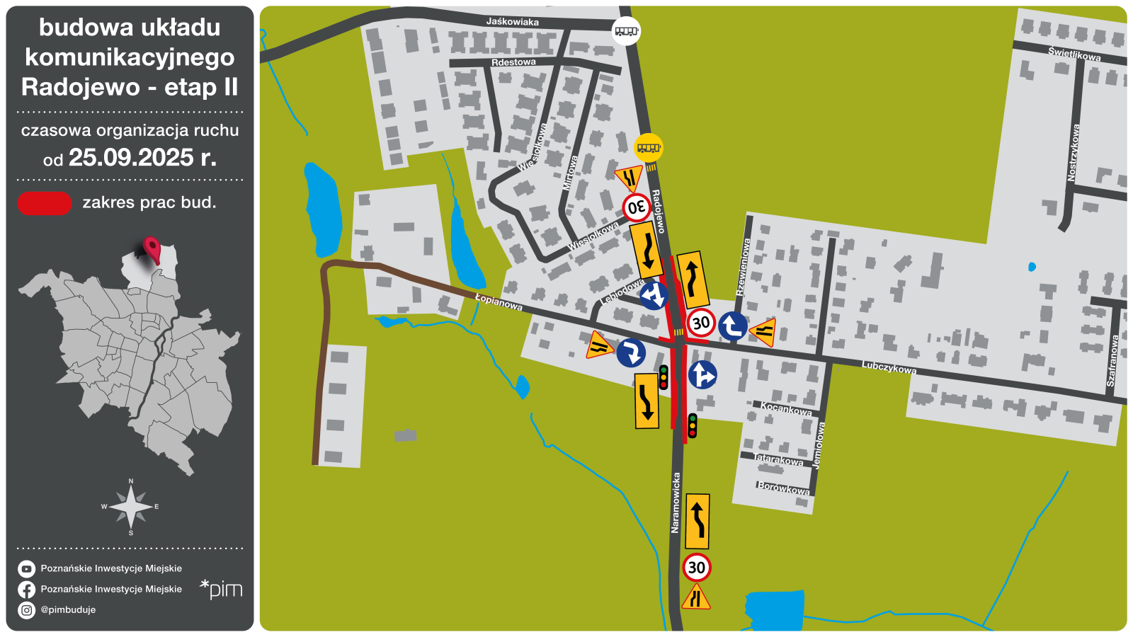Obecnie na ul. Radojewo, na niespełna 50-metrowym odcinku drogi, obowiązuje ruch wahadłowy sterowany sygnalizacją świetlną. Niedostępny jest zachodni pas ruchu, na którym prowadzone są prace w zakresie kanalizacji deszczowej i podbudowy jezdni wraz z nową nawierzchnią. Od 25 września ruch poprowadzony zostanie nowo wykonaną częścią zachodnią jezdni ul. Radojewo, a prace przeniosą się na stronę wschodnią. Nadal ruch na skrzyżowaniu będzie odbywał się wahadłowo, tym razem na odcinku ul. Radojewo od strony Poznania, w rejonie powstającej wysepki rozdzielającej.