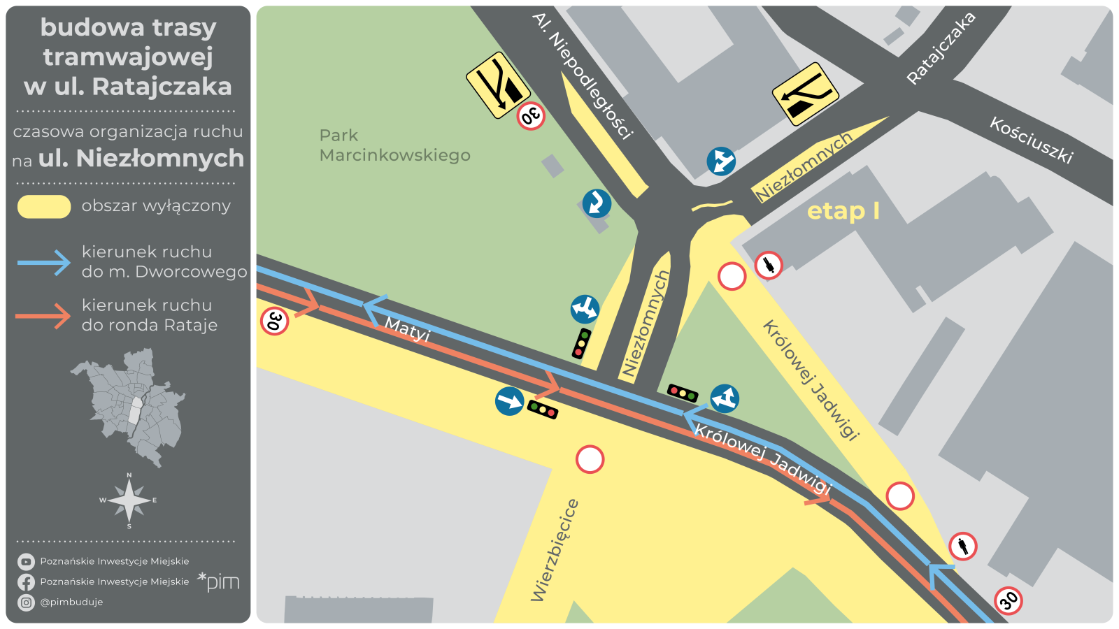 W rejonie węzła Wierzbięcice obowiązuje czasowa organizacja ruchu ze względu na budowę trasy tramwajowej w ul. Ratajczaka. 23 lutego (poniedziałek) zmieni się układ pasów ruchu na ul. Niezłomnych.