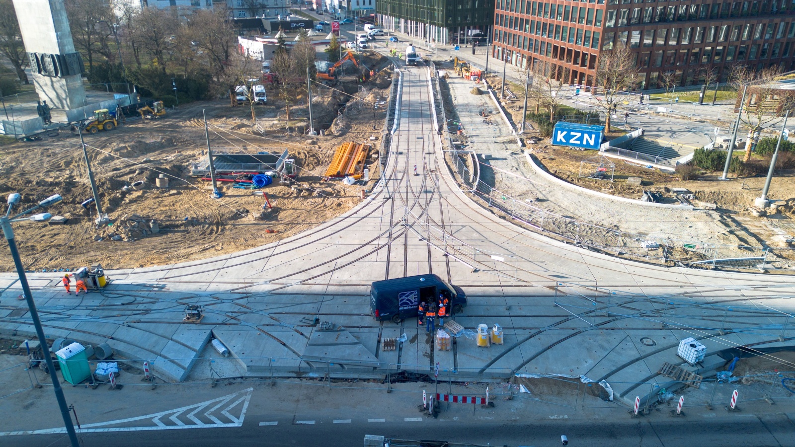 Udostępnienie części skrzyżowania przy Nowym Rynku oznacza, że tramwaje przejadą przez plac budowy. Na skrzyżowaniu będą kontynuowane pozostałe roboty torowe i drogowe.