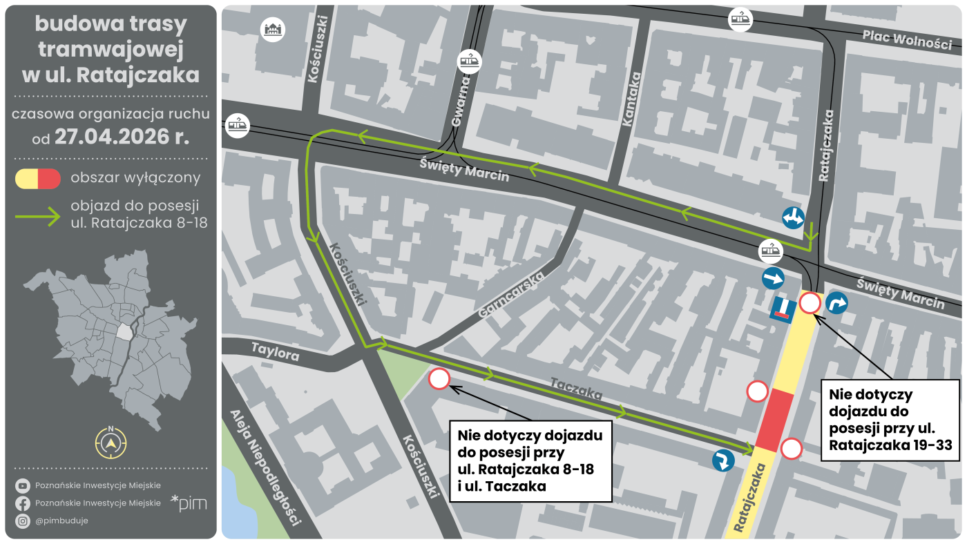 27 kwietnia (poniedziałek) całkowicie zamknięty zostanie odcinek ul. Ratajczaka od bramy do posesji nr 24 do skrzyżowania z ul. Taczaka. Oznacza to, że dojazd do posesji przy ul. Ratajczaka 8-18 (odcinek między ul. Taczaka a Ogrodową i Powstańców Wlkp.) wyznaczony zostanie przez ul. Taczaka. Dojazd do posesji przy ul. Ratajczaka 19-33 będzie możliwy od ul. Św. Marcin. Całkowite zamknięcie odcinka ul. Ratajczaka od posesji nr 24 do ul. Taczaka jest konieczne z uwagi na prace w zakresie sieci podziemnych.
