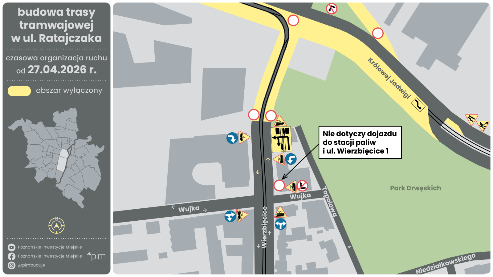 Z uwagi na postęp robót realizowanych w ramach budowy trasy tramwajowej w ul. Ratajczaka, konieczne jest wprowadzenie zmiany w organizacji ruchu w zakresie dojazdu do posesji. Przewidziana jest też przerwa w dostawie wody.