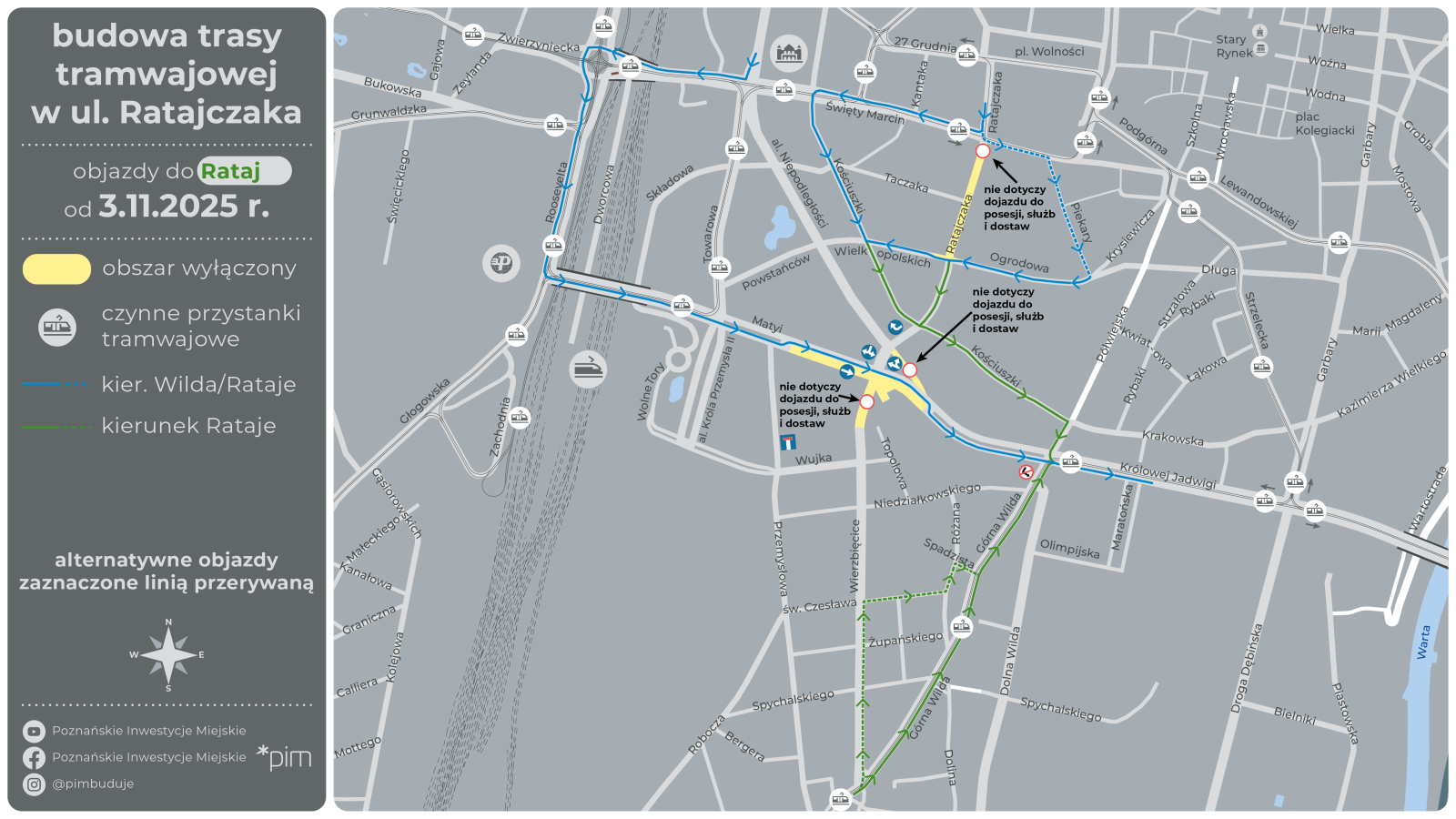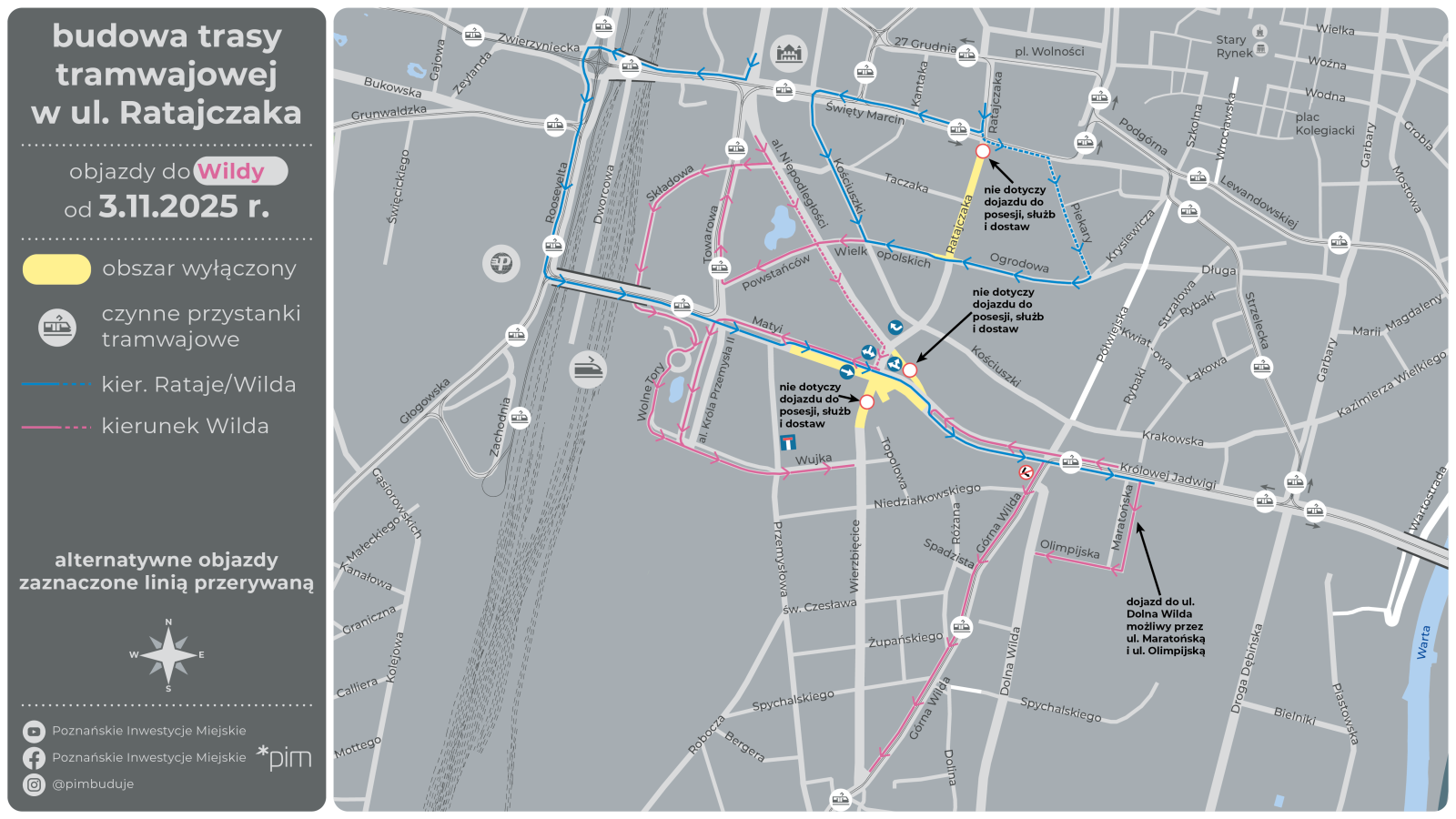 - W ostatnich tygodniach prowadzone były niewidoczne w terenie, ale intensywne przygotowania do inwestycji. Wykonawca koncentrował się na opracowaniu projektu czasowej organizacji ruchu, za nami wiele spotkań i ustaleń w zakresie najbardziej optymalnych rozwiązań. Zależy nam na sprawnym przeprowadzeniu prac budowlanych, by trwały możliwie najkrócej. Roboty równolegle rozpoczną się na węźle Wierzbięcice oraz na odcinku ul. Ratajczaka między Św. Marcinem a ul. Ogrodową. Wyłączenie torowiska na węźle skutkować będzie zmianami tras tramwajów, które z kolei zostaną skoordynowane pracami na moście Chrobrego, by tymczasowy układ tras był czytelny dla pasażerów – wyjaśnia Tomasz Płóciniczak, wiceprezes spółki Poznańskie Inwestycje Miejskie.