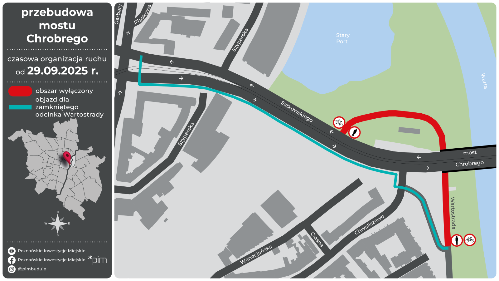 Ze względu organizację zaplecza budowy i dojazdów, konieczne jest wyłączenie z ruchu Wartostrady na zachodnim brzegu rzeki. Od 29 września piesi i rowerzyści nie będą mogli poruszać się Wartostradą między Starym Portem a Chwaliszewem. Od strony południowej piesi i rowerzyści powinni kierować się do przejścia i przejazdu rowerowego przez ul. Chwaliszewo. Schody po tej stronie mostu także będą niedostępne. Natomiast po stronie północnej, ze Starym Portem, wyłączony z ruchu zostanie zjazd i zejście z ul. Estkowskiego na Wartostradę.