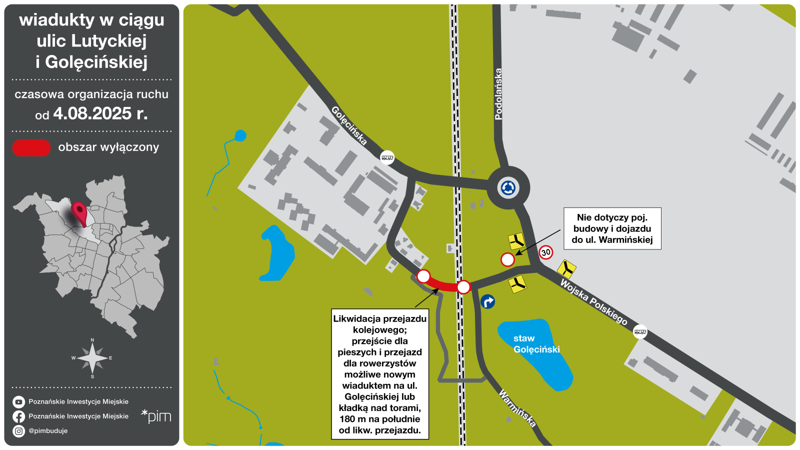 Ze względu na oddanie od użytku nowej infrastruktury, przejazd i przejście w miejscu starego śladu ul. Golęcińskiej zostaną zlikwidowane na stałe. Podobne prace przewidziane są również w miejscu starego przejazdu w ciągu ul. Lutyckiej. Rozbiórka w tej lokalizacji także rozpocznie się w poniedziałek 4 sierpnia. Nie będzie miała jednak wpływu na ruch pojazdów czy pieszych, gdyż aktualnie przejazd ten jest niedostępny. Docelowo do dyspozycji kierowców będzie nowy wiadukt w ciągu ul. Lutyckiej – nad torami kolejowymi i ul. Podolańską. Natomiast dla pieszych i rowerzystów powstaje osobna kładka, równoległa do wiaduktu samochodowego.