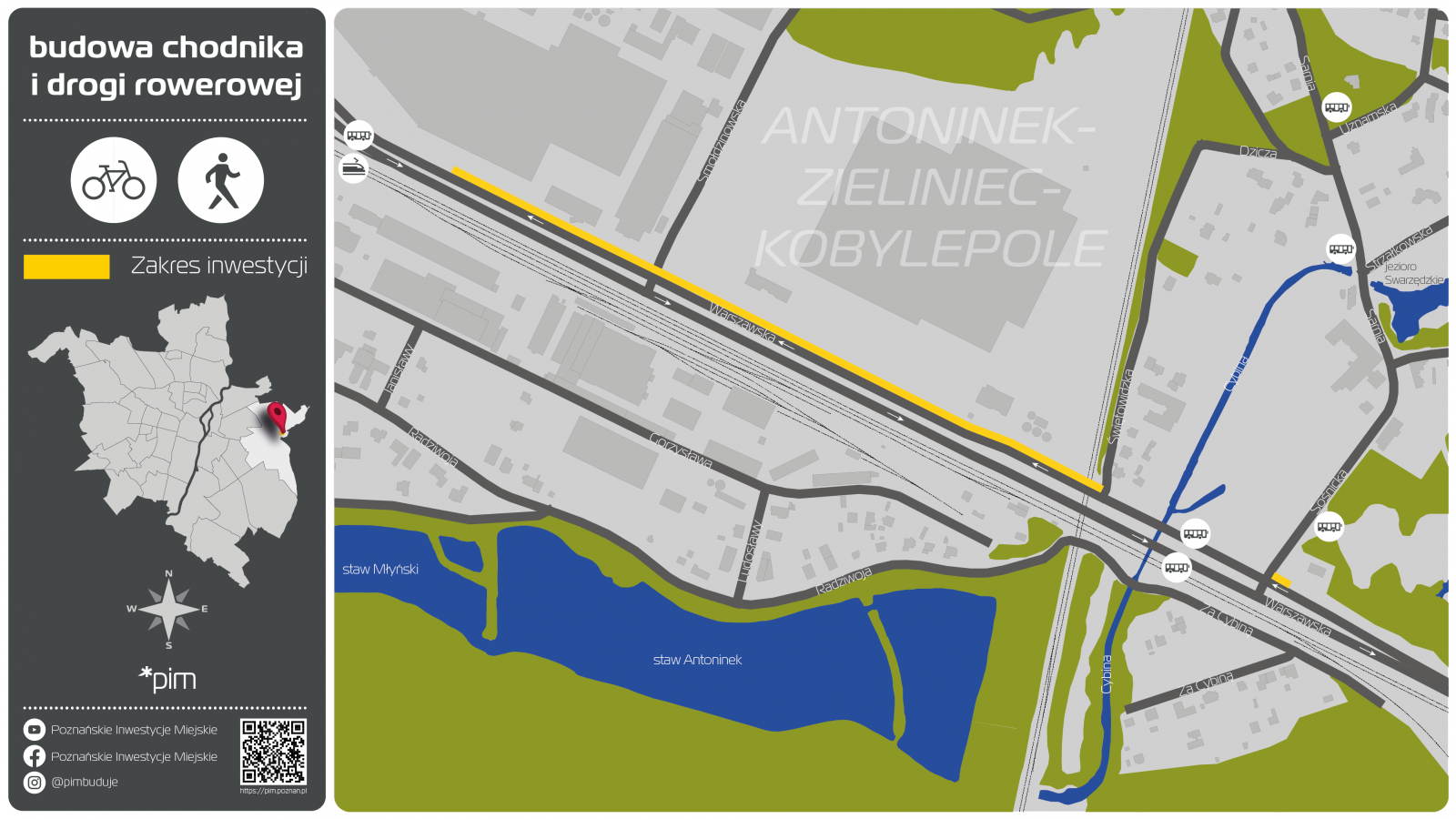 Zadanie polega na wykonaniu dokumentacji projektowej wraz z uzyskaniem wszelkich niezbędnych decyzji administracyjnych. Projekt zakłada wykonanie drogi dla rowerów, chodnika, nowego oświetlenia oraz budowę kanału technologicznego.
