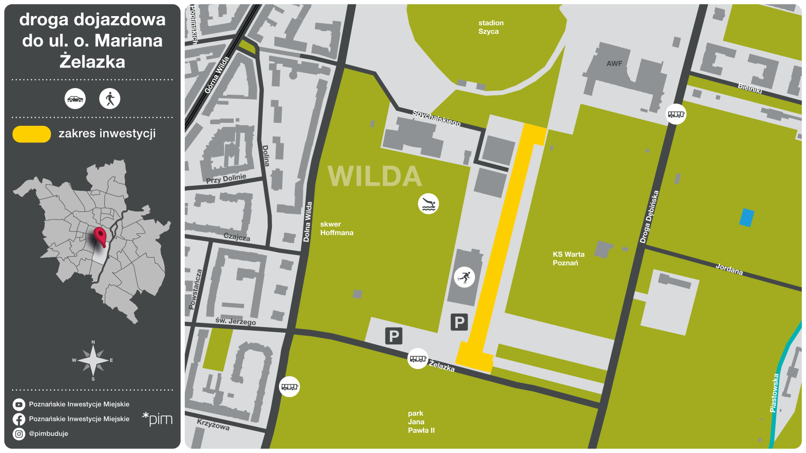 W ramach zadania zaprojektowana została droga dojazdowa przy ul. oj. Mariana Żelazka. Droga ma stanowić dojazd do obiektów sportowych w tym rejonie oraz parkingu.