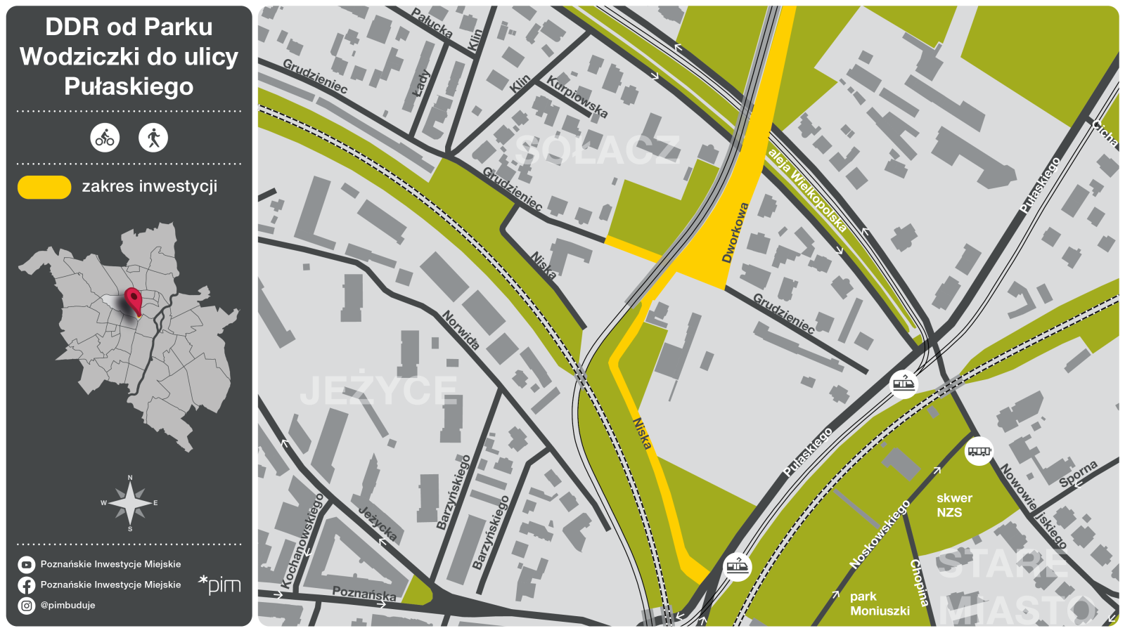 W ramach zadania zaprojektowana zostanie nowa droga pieszo-rowerowa od projektowanej kładki w Parku Wodziczki do ul. Pułaskiego wraz z dowiązaniem do ul. Grudzieniec i wykorzystaniem ul. Niskiej.